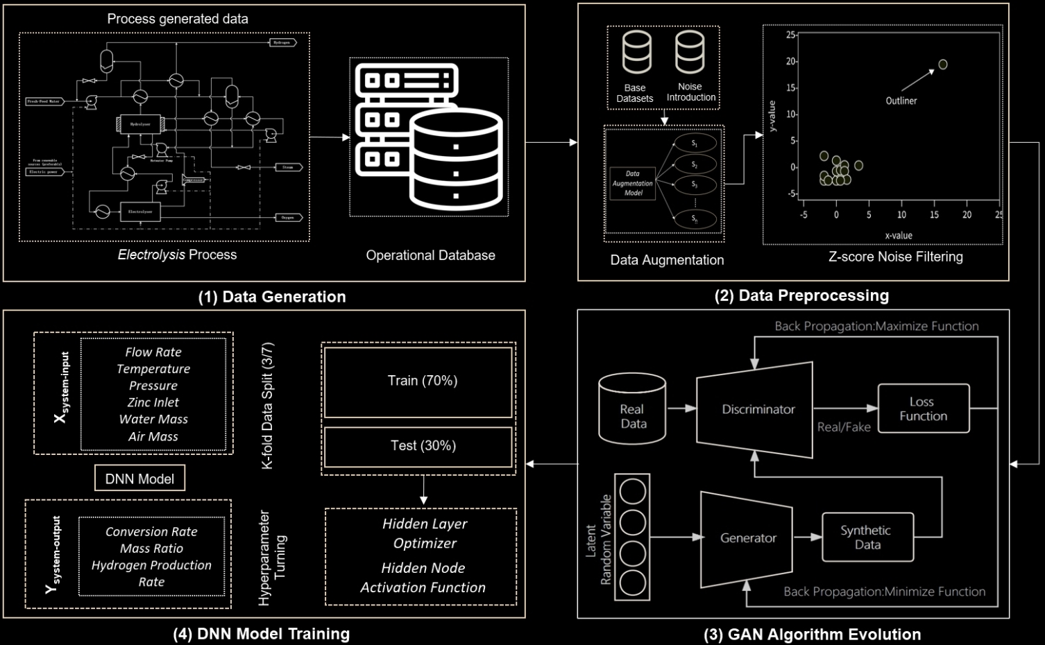 - The first part of Chapter 3 introduces an innovative approach to optimizing the operational dynamics of electrolysis energy systems using Generative Adversarial Networks (GANs). This section delves into the challenges of small dataset sizes in the field of renewable energy research, particularly in the context of electrolysis for hydrogen production. The researchers employed GANs to generate synthetic data, thus augmenting the existing datasets and overcoming the limitations imposed by scarce data. This process not only enhances the robustness of the model training but also preserves the statistical integrity of the original dataset, expanding it five-fold to over 2,000 data points. The preliminary evaluation of this synthetic data, conducted using a deep neural network (DNN) architecture, showed an increase in prediction accuracy, as evidenced by improvements in mean squared error (MSE) and R-squared (R²) metrics. This innovative approach signifies a leap forward in the predictive modeling of electrolysis system dynamics, paving the way for more efficient and reliable hydrogen production.