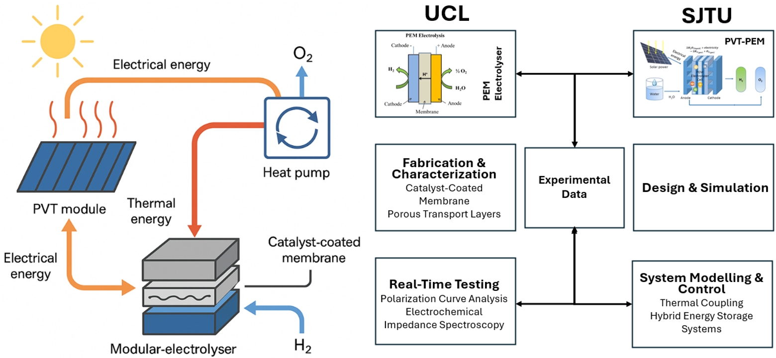 - SJTU: System-level design and simulation of photovoltaic-thermal (PVT) integrated PEM electrolysis platforms with heat pump coupling to enhance thermal utilisation and overall system efficiency.